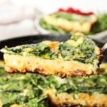 When the bacon, onion, and garlic are done, turn off the stove. Spread across the bottom of the skillet so it is evenly distributed. Layer the shredded cheese, parmesan cheese, and spinach on top. Pour your egg mixture over everything.