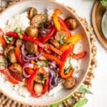 Sausage, peppers, and onion cook together in the oven in this quick Italian sausage and peppers recipe! Serve over rice, pasta, or roasted potatoes. You can also use this entree in hoagie rolls.