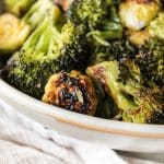 Trim the bottom of each brussels sprout and peel away the first layer of leaves. That's where you usually see the dirt and any brown sprouts. Once this is done you'll have beautiful little bright green sprouts. Slice each sprout in half and add them to your baking sheet in a single layer.
