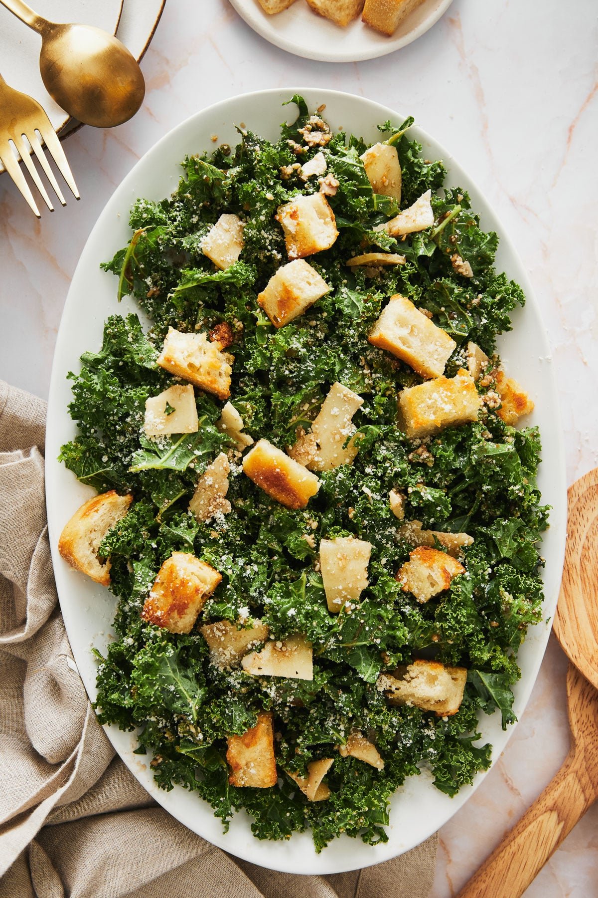 The star of this salad is the croutons and a generous portion of parmesan. What better way to get in a serving of kale than with crunchy bread and shaved parmesan, right?