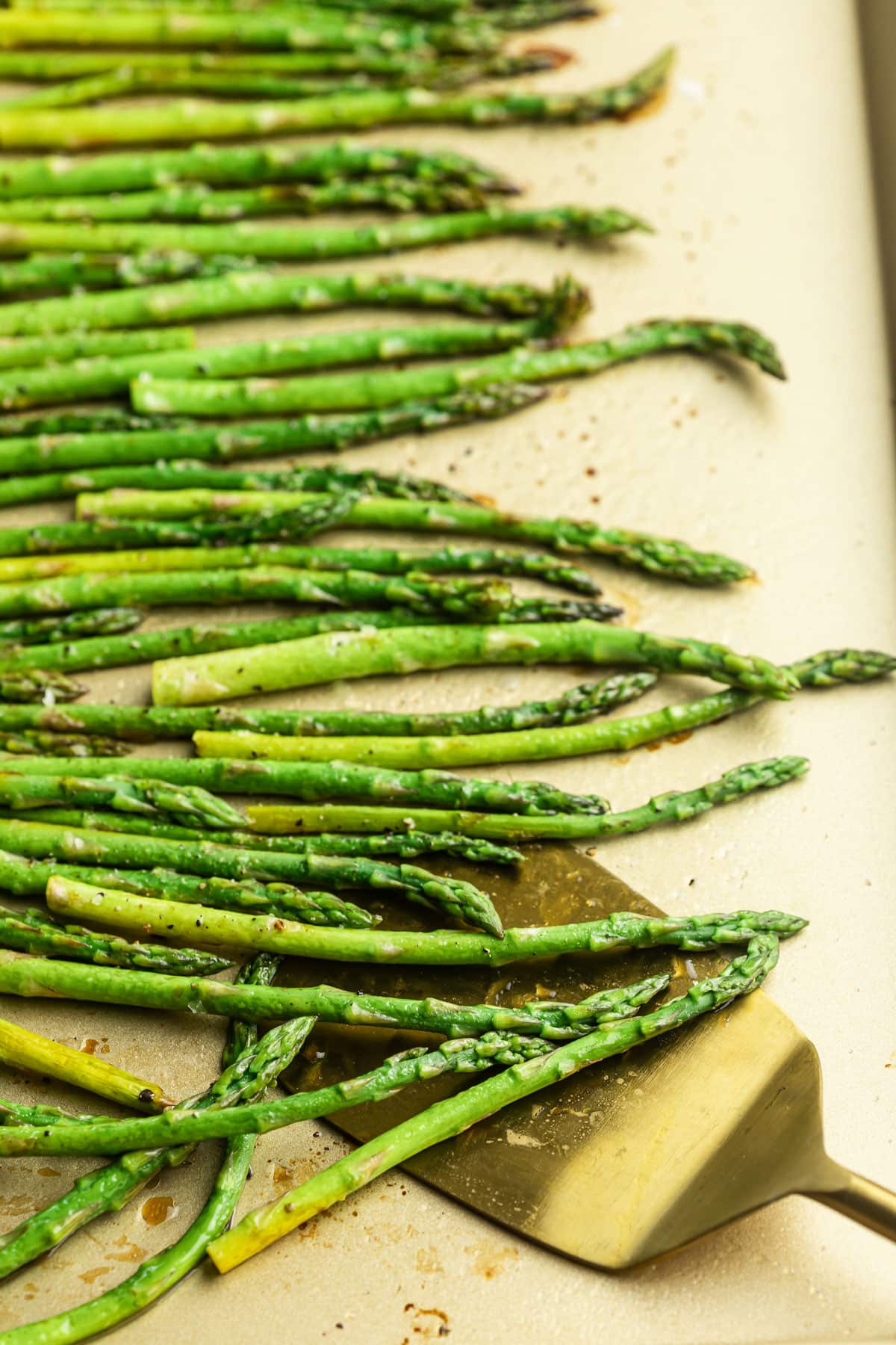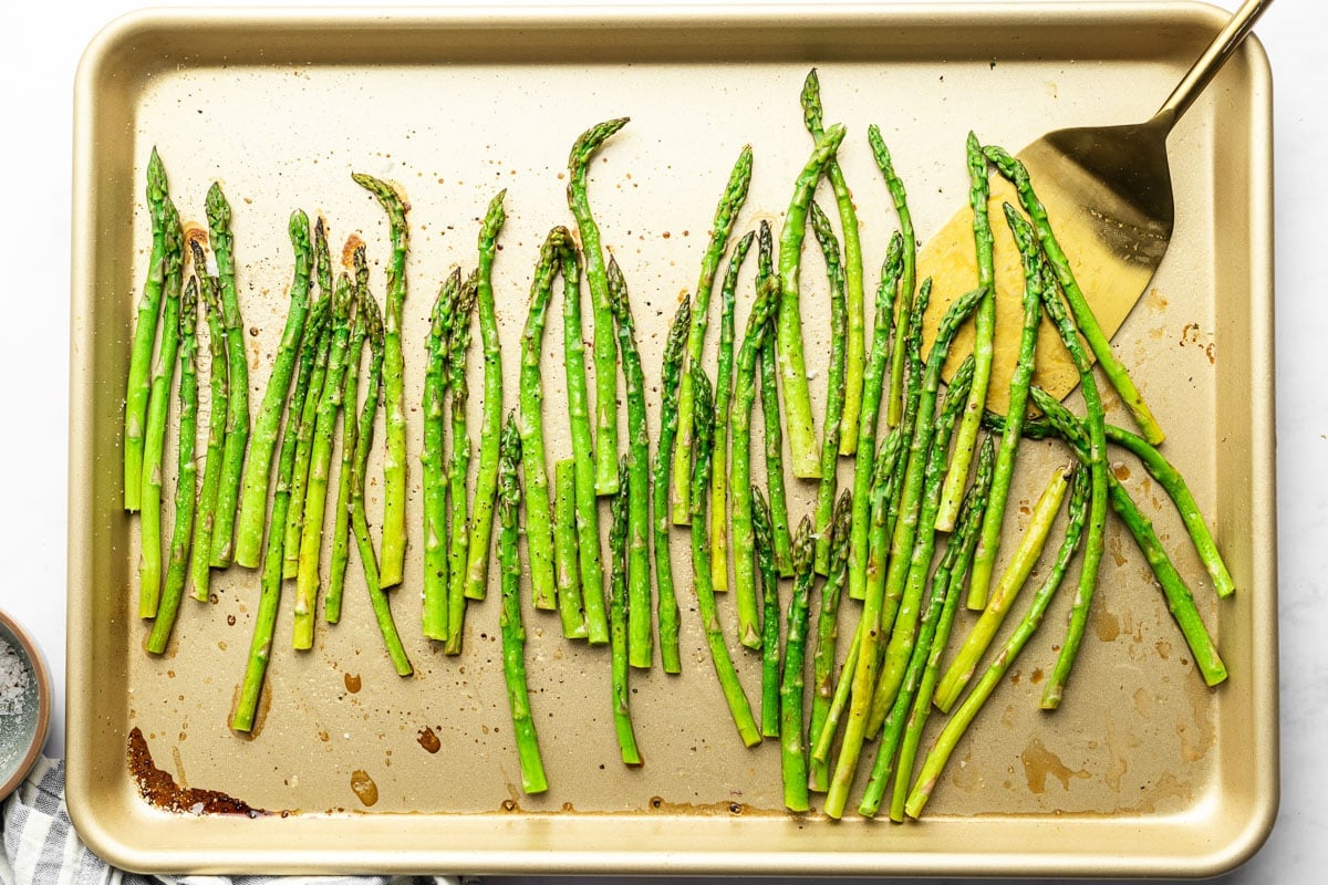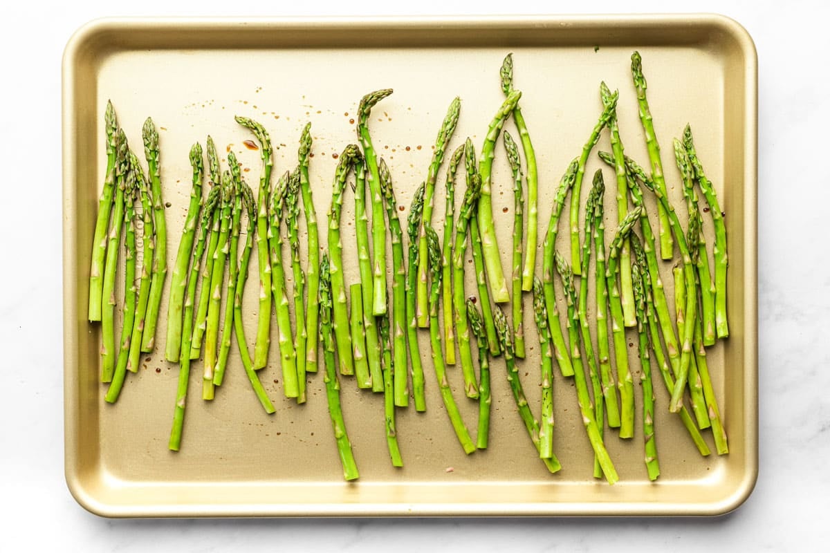- Lay the asparagus in a single layer on a baking sheet or baking dish. (Both work great.) It's Important that it's a single layer as it allows the asparagus to cook quickly and evenly.