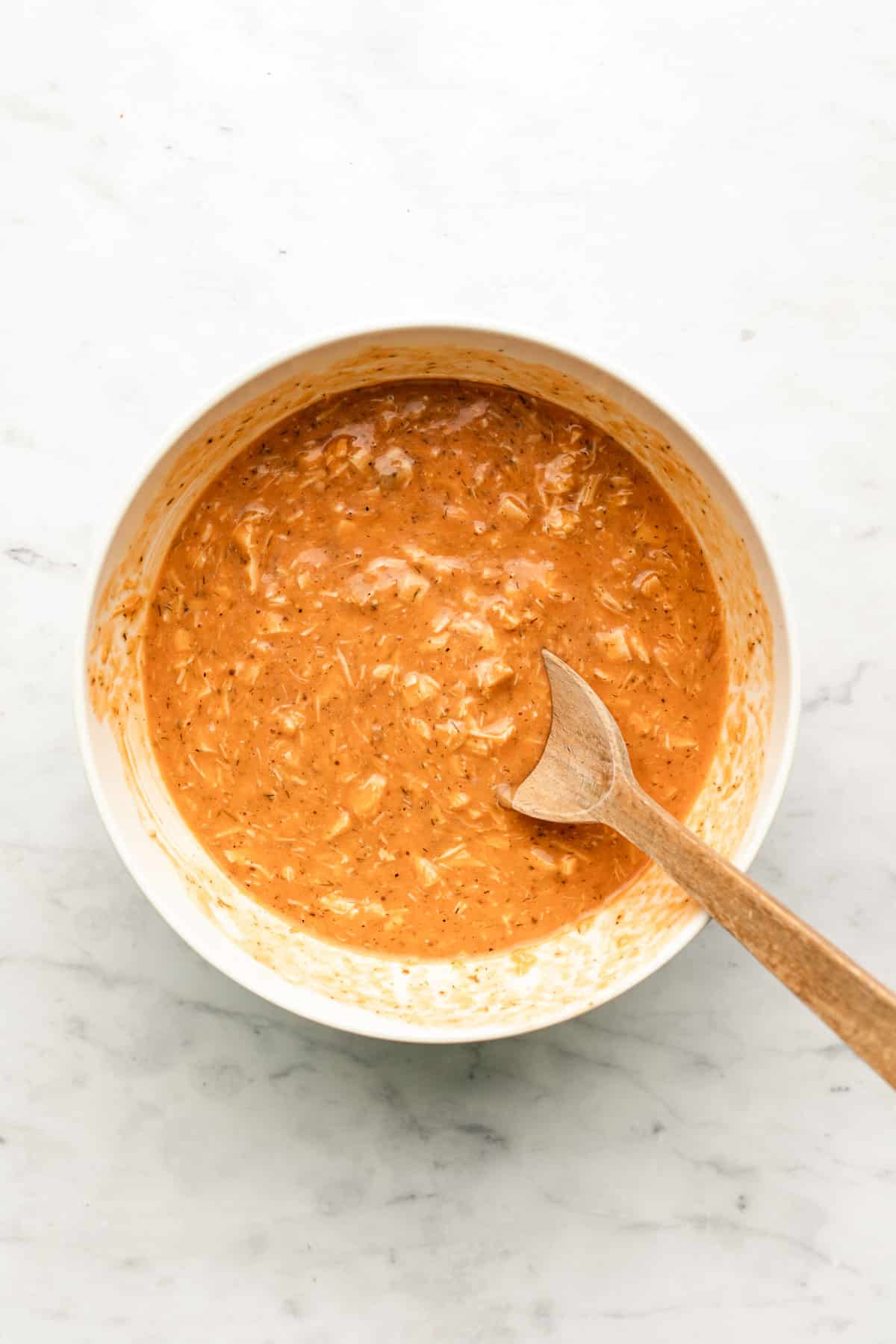 - In a large bowl combine your shredded chicken, Ranch Dressing, Frank’s Red Hot Sauce, and salt. Stir together.