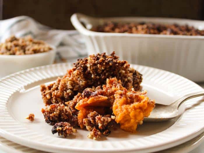 - Add the Pecan Crumble on top of the sweet potatoes and spread in an even layer.