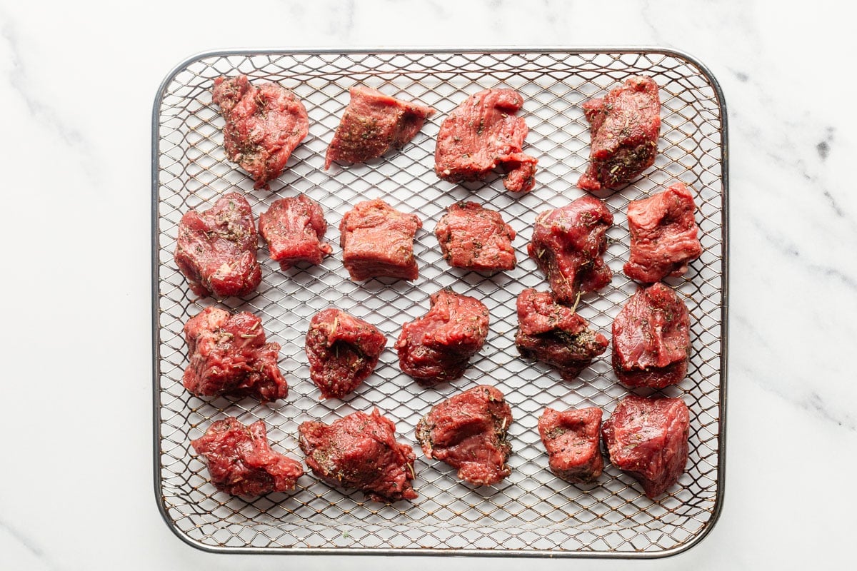 - While cutting the steak into 1-inch cubes, preheat air fryer to 400 degrees.