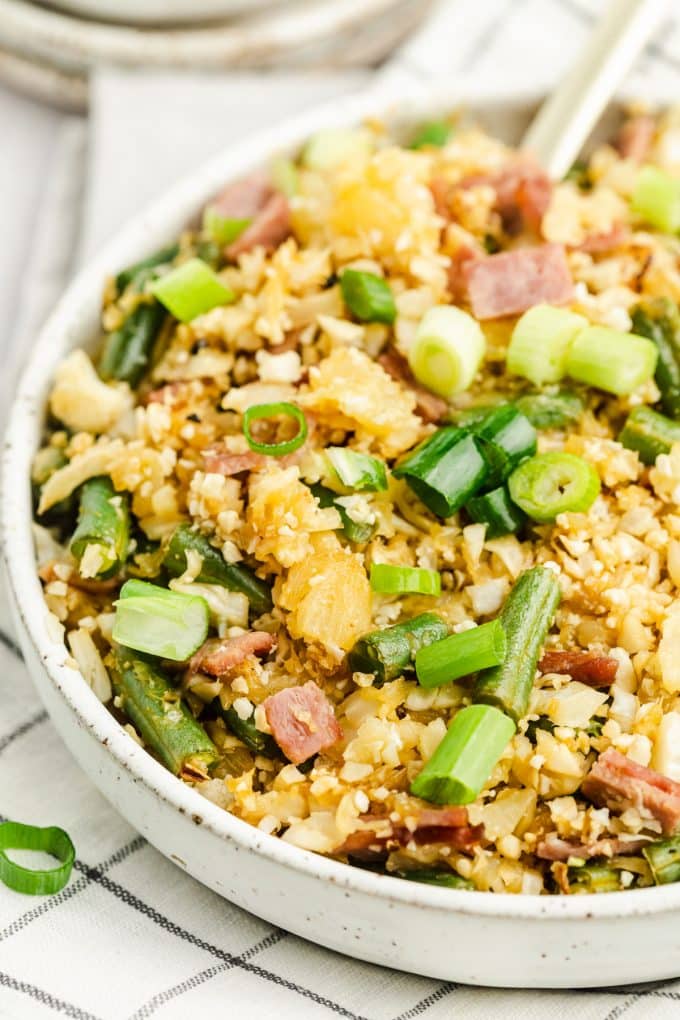This fun twist on a low carb fried rice is made with cauliflower! It packs a punch of sweetness thanks to pineapple, includes the crunch of a few veggies, and delivers all the deliciousness of bacon. You’ll love this tasty side!