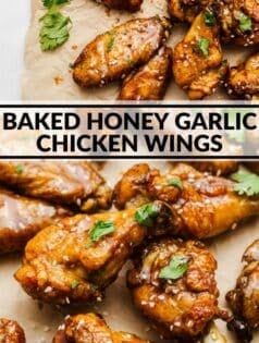 These crispy wings are baked and tossed in an easy 4-ingredient honey garlic sauce! They’re sticky and delicious as an appetizer, snack, or entree.