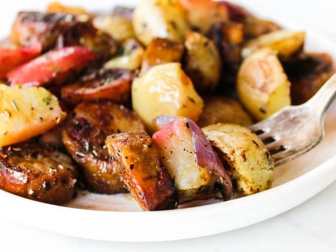 Roasting apples and potatoes together yields this beautifully sweet caramelized flavor that is just oh so very good. My original Simply Roasted Apples & Potatoes were the inspiration for this sheet pan dinner.