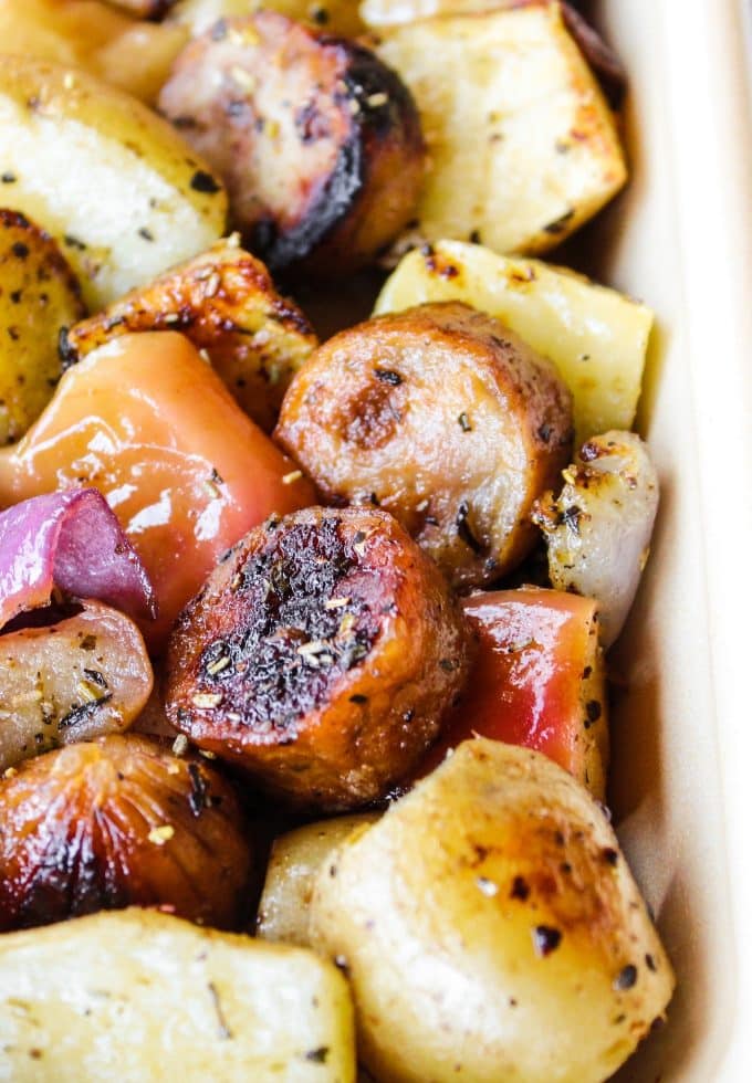 Sausage, apples, and potatoes roast together to create an incredibly easy tasty meal that’s ready in about 30 minutes! I love the sweetness that the apple adds and I’m betting you will too.