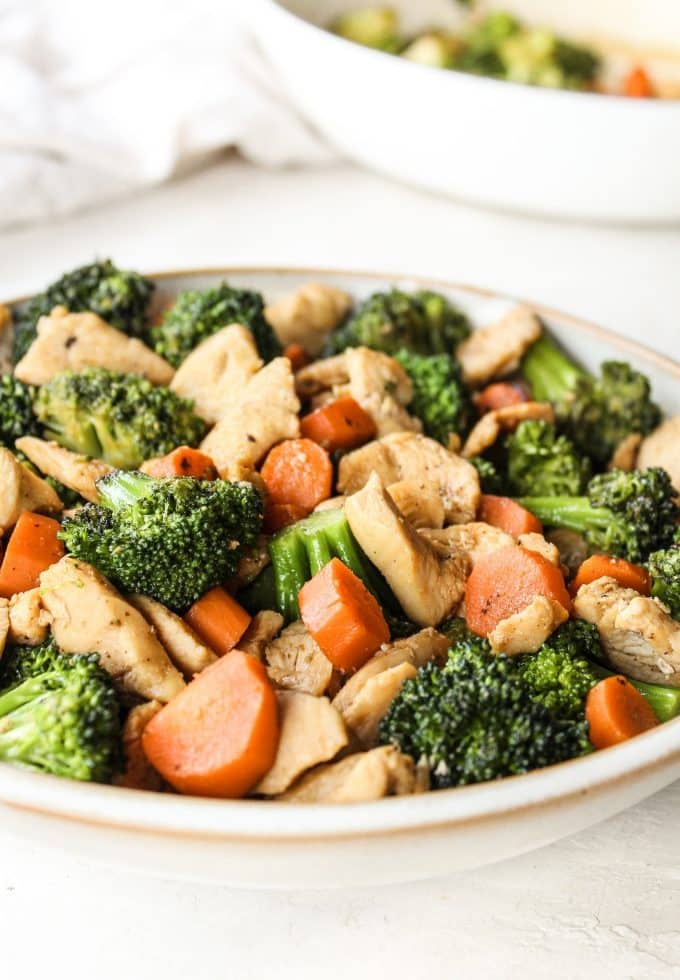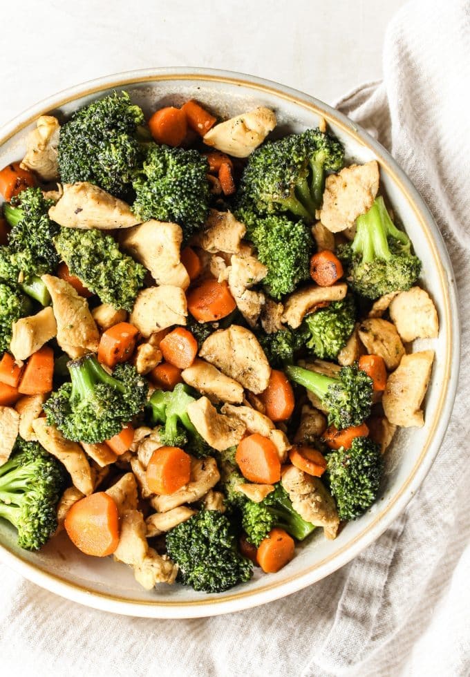 Tender chunks of chicken breasts, fresh broccoli, and carrots. You get a protein and two veggies so your dinner is complete! Of course you can always toss this over cauliflower rice, traditional rice, or sauteed spinach (I just did that for my lunch today) if you like.