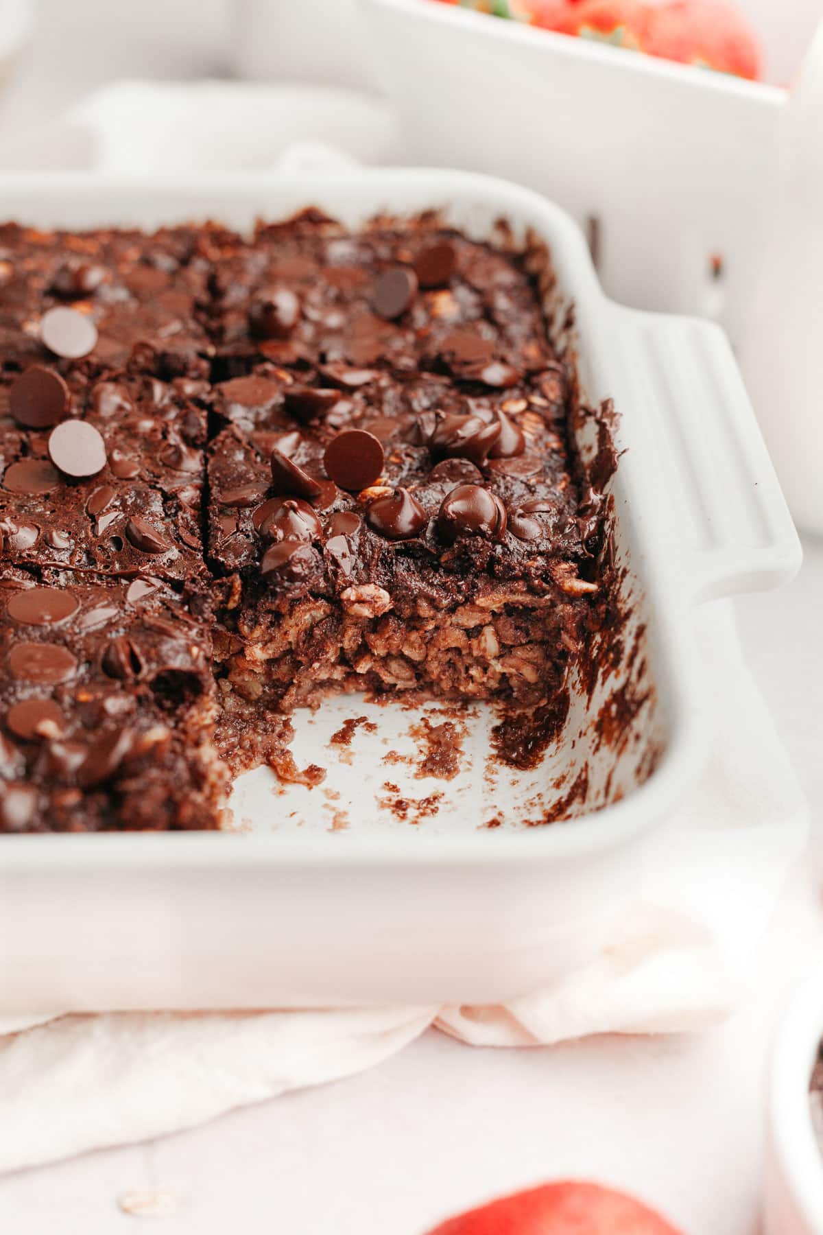 Chocolate Baked Oatmeal can be enjoyed right away but it’s also the ultimate make ahead breakfast! Reheat one slice at a time for a quick healthy meal to start your day all week.