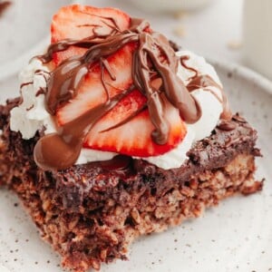Scoop it into bowls or (if youโre really want it to be impressive) slice into squares and top with additional maple syrup or honey, nutella, whipped cream, vanilla yogurt, fresh banana slices, or strawberries and serve!