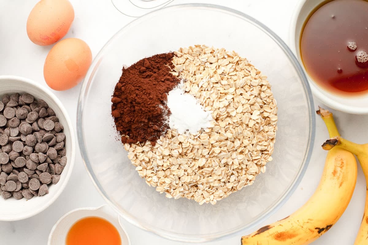 - In a large bowl, stir together oats, cocoa powder, and baking powder.
