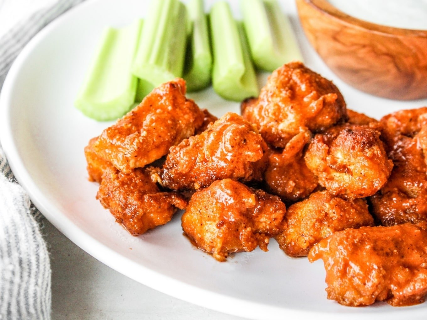 These chicken bites are breaded in almond flour and seasonings, baked to crispy perfection, and then tossed in an easy homemade buffalo sauce. Enjoy them as an appetizer or entree!
