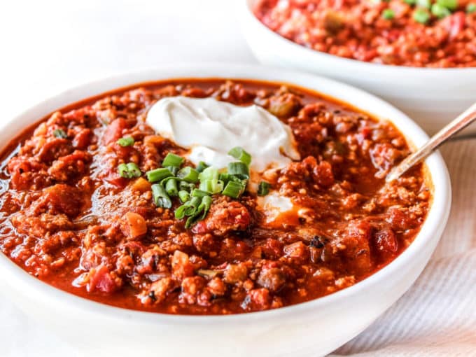 This healthy turkey chili is the very best! Itโs loaded with ground turkey, tomatoes, green chiles, garlic, onion, and lots of seasonings. So hearty and easy to make โ ready in only 30 minutes! Dairy-free, gluten-free, Whole30, Paleo, and Keto too!