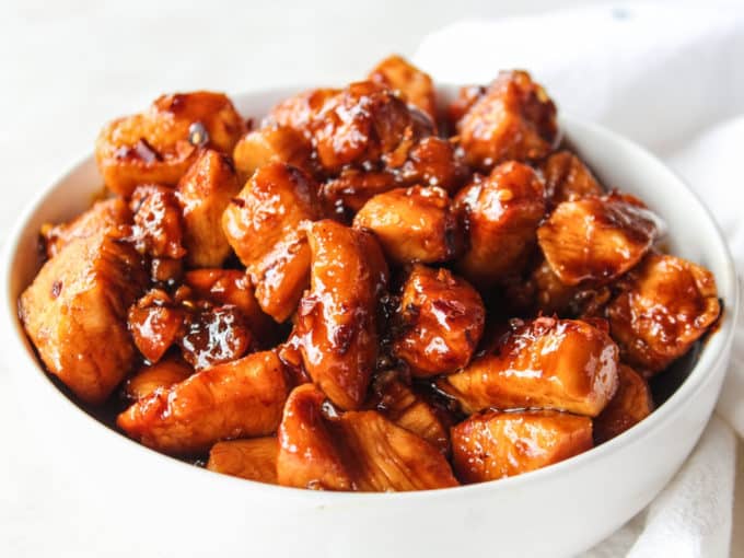 These chicken bites are both sweet and spicy thanks to a sticky 5-ingredient sauce! Serve over cauliflower or traditional rice and with veggies for an incredible meal or offer them to guests as an appetizer.