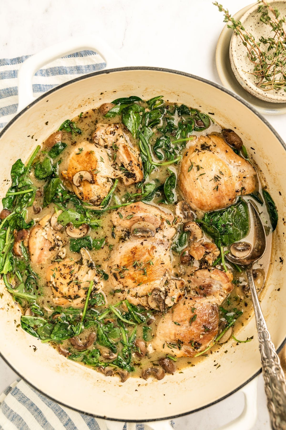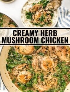 These chicken thighs simmer in a creamy mushroom sauce. Serve over white rice, cauliflower rice, or roasted potatoes.