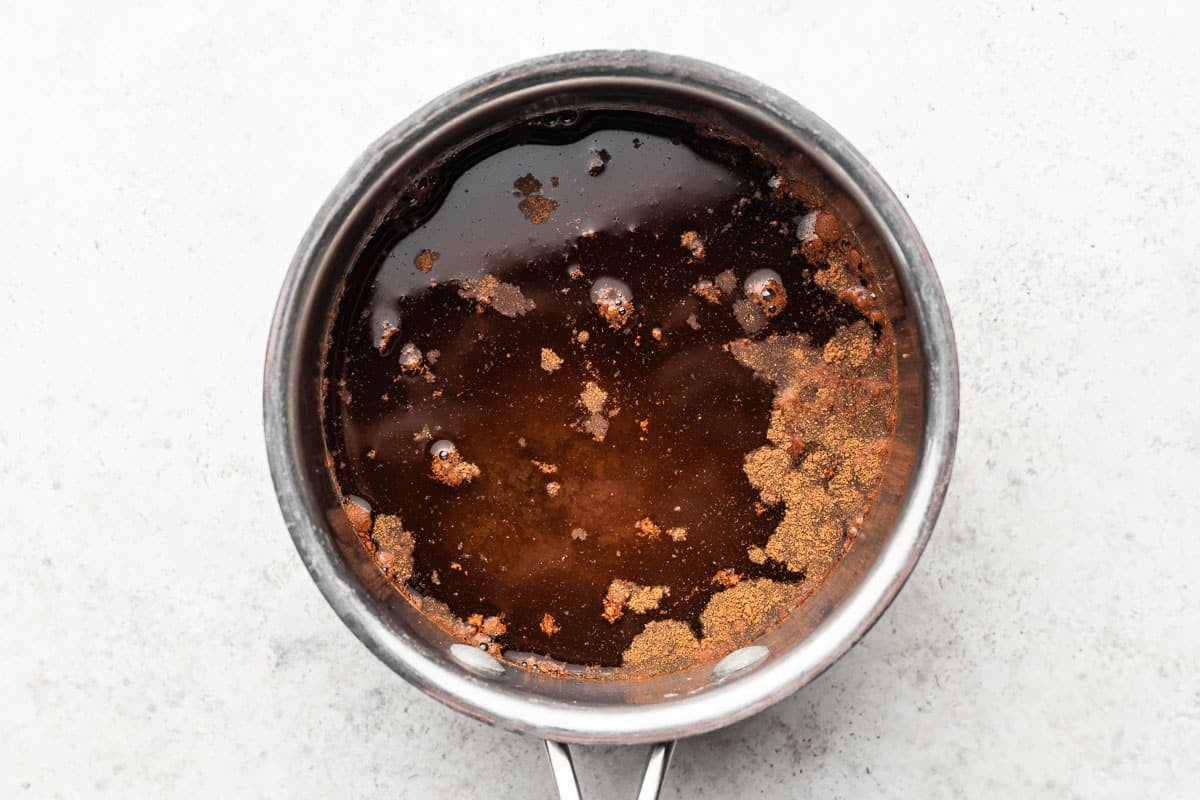 - Add the brown sugar, water, vanilla extract, and cinnamon to a small sauce pan. Simmer on medium heat until sugar has dissolved and syrup has thickened a bit (it will continue to thicken as it cools). Allow to cool.