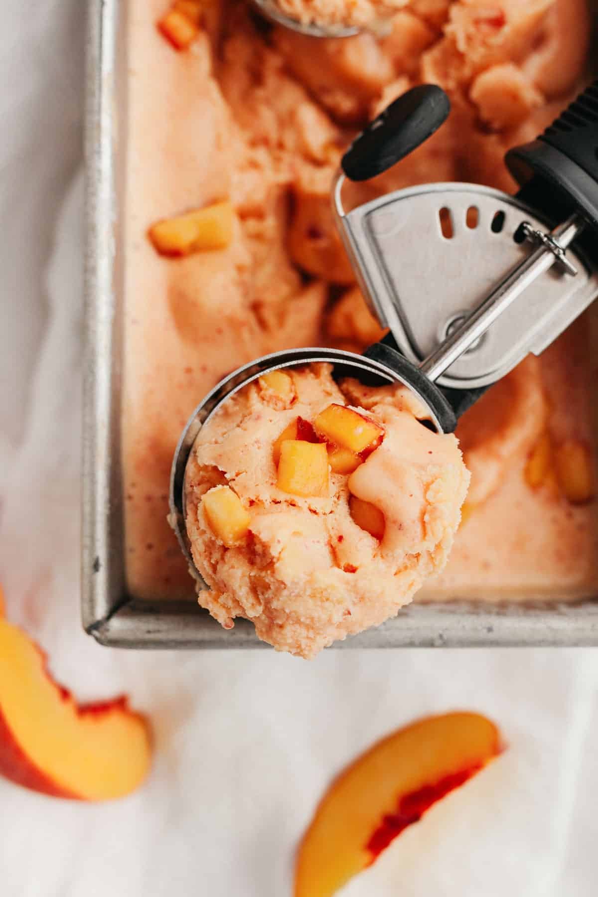 - Frozen peaches: Weโre including lots of frozen peaches in this delicious frozen yogurt for maximum peach flavor. Since theyโre already frozen they also help us achieve the texture we want quickly!