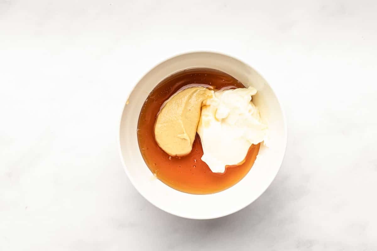 - Add mayonnaise, honey, and dijon mustard to a small bowl. Stir until well combined.