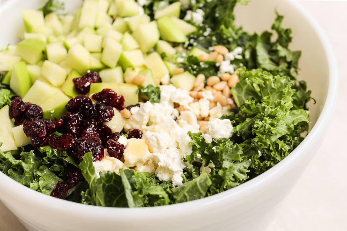 Often times people will recommend massaging the kale with a little olive oil or lemon juice. This is an optional step that can soften the leaves and tone down the bitterness. Because we’re using a sweet dressing and chopping the leaves into bite-sized pieces I’ve found that massaging the kale is an unnecessary step in this particular recipe.