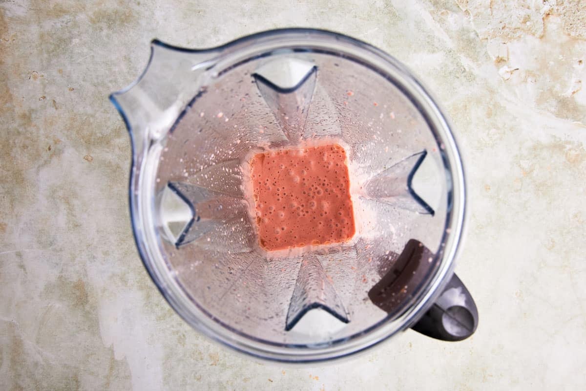 While the pecans are roasting, let’s create the strawberry dressing. Add all the dressing ingredients (strawberries, light olive oil, white wine vinegar, orange juice, basil, and salt) to a blender or food processor. Blend until smooth.