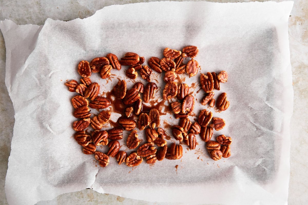 - Once cool, use a knife to chop the candied pecans. You can leave them in halves if you prefer. Set aside.