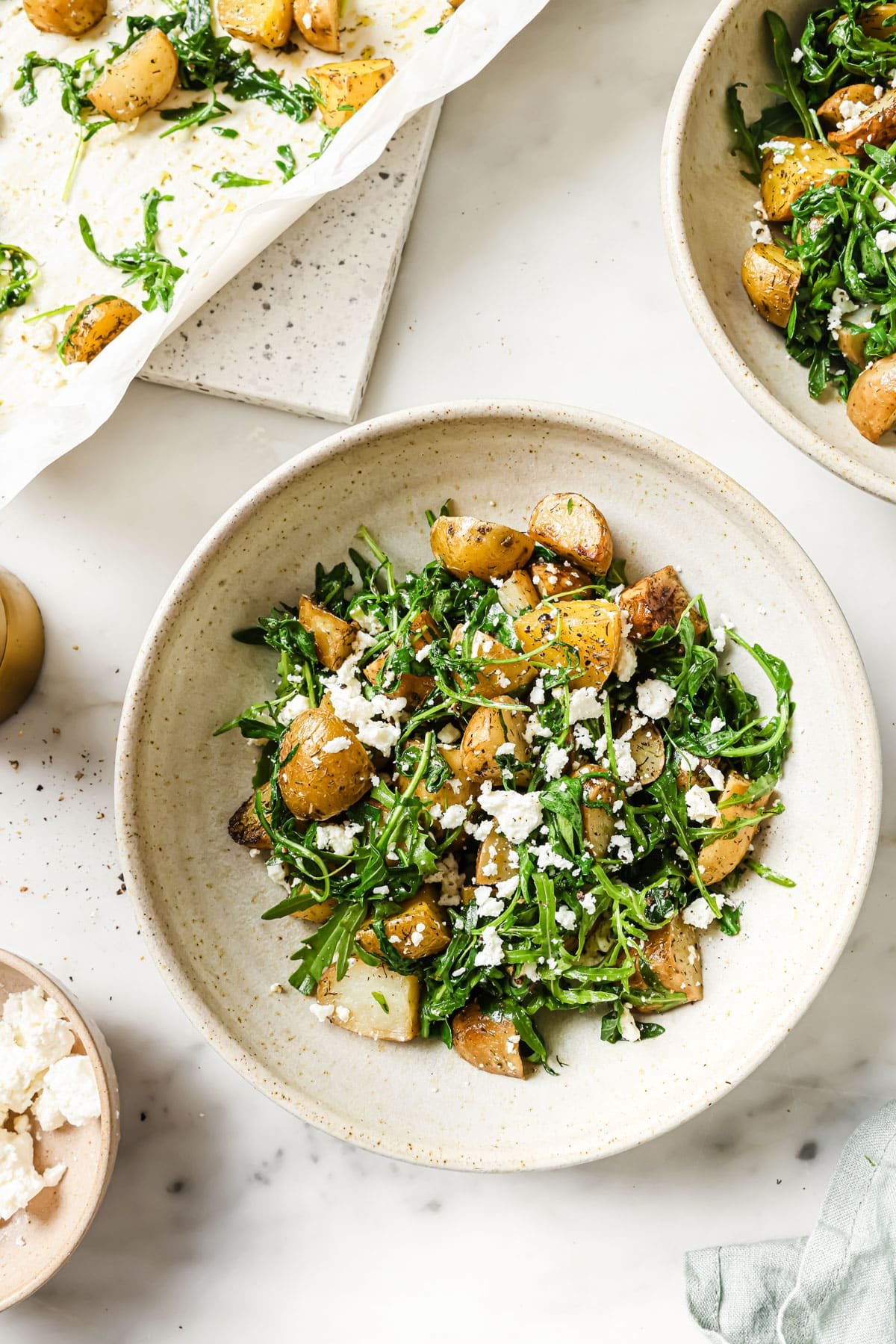 This warm salad of tender roasted potatoes, fresh arugula, and creamy feta is a deliciously simple side. It’s a comforting addition to any meal.