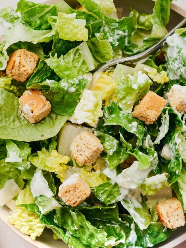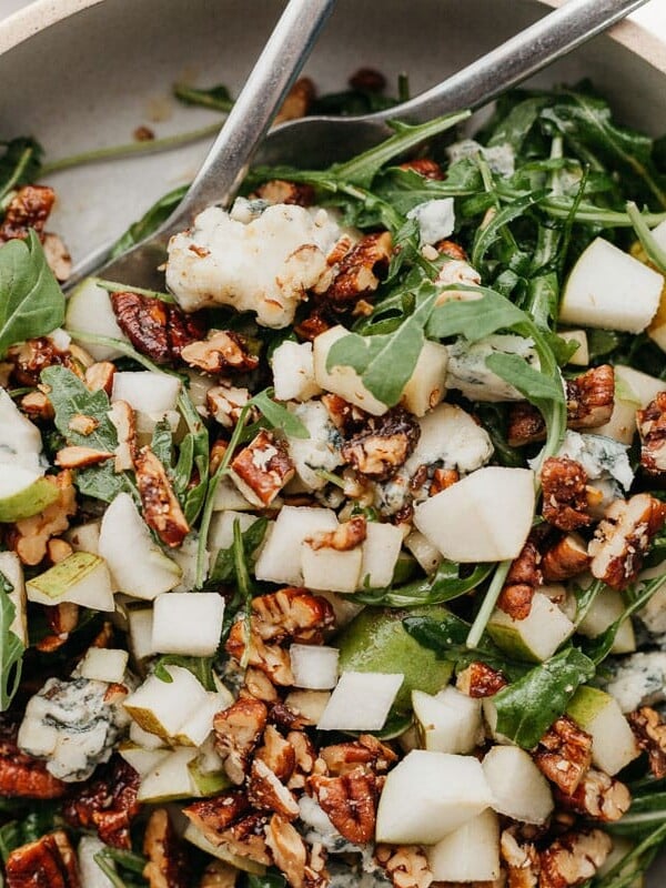 This delicious salad includes peppery arugula, sweet pears, creamy crumbled gorgonzola or blue cheese, and candied pecans. Toss it all in my simple homemade dressing.