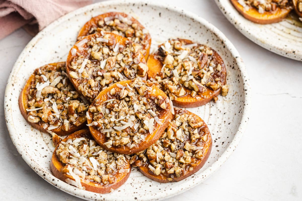 Cinnamon pecan sweet potato rounds capture the rich flavor of a sweet potato casserole but they're healthier and refined sugar free. Topped with an easy cinnamon pecan crumble!
