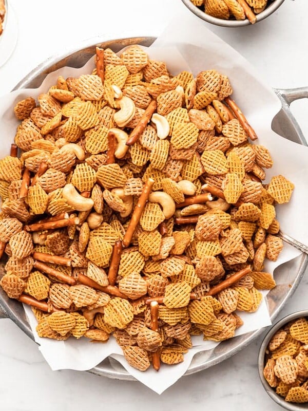 This savory party mix comes from my beloved mother in-law and you're going to love it. We make it all December long and keep it on the counter for quick snacking!