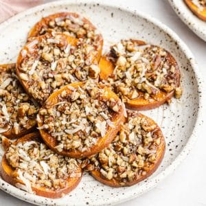 These baked sweet potato slices capture the rich flavor of a sweet potato casserole but they’re healthier and refined sugar free. Topped with an easy cinnamon pecan crumble!