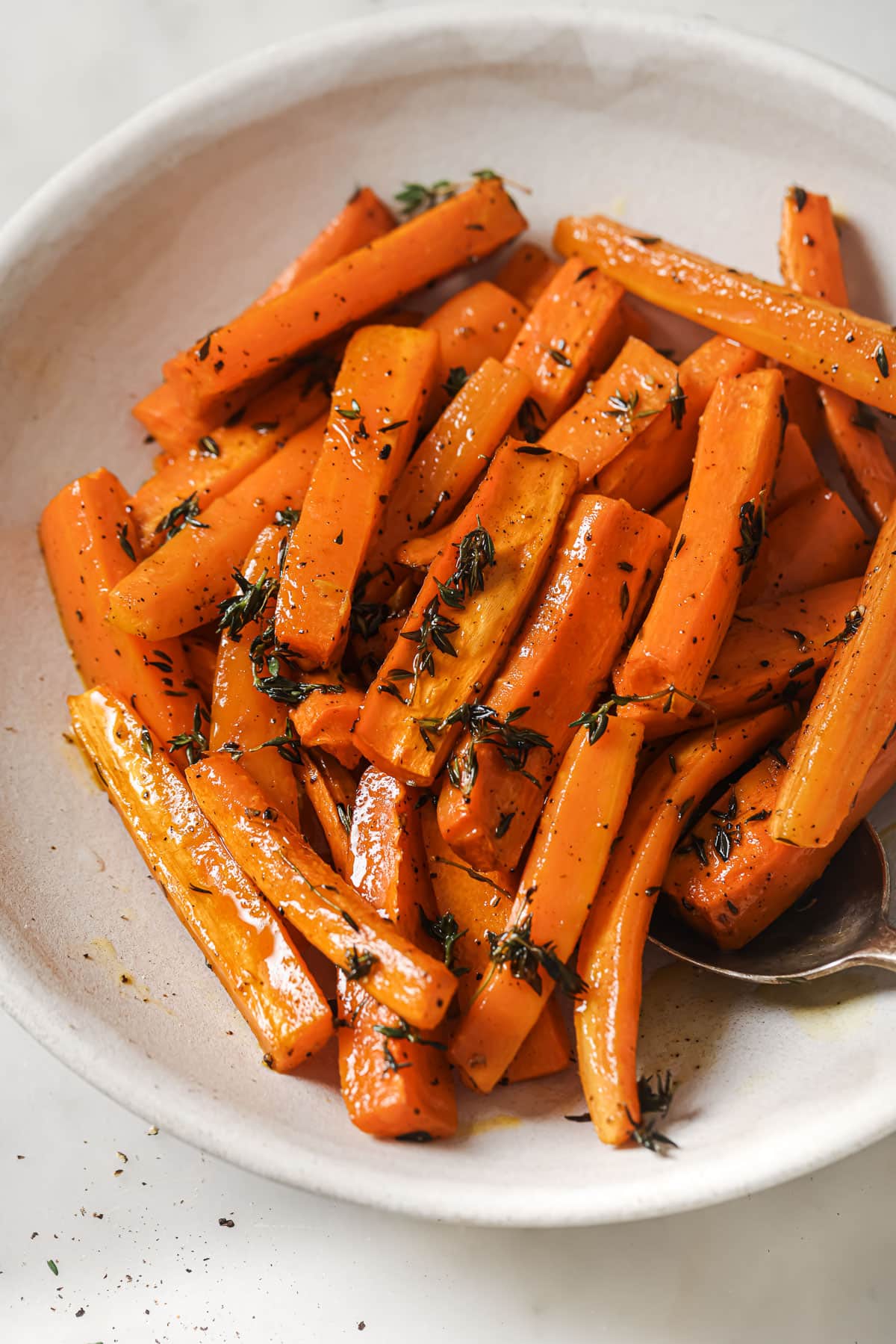 Lemon Thyme Roasted Carrots require a few simple ingredients like olive oil, fresh lemon juice, and thyme. Pop them in the oven. You’ll have perfectly tender carrots in less than 30 minutes.