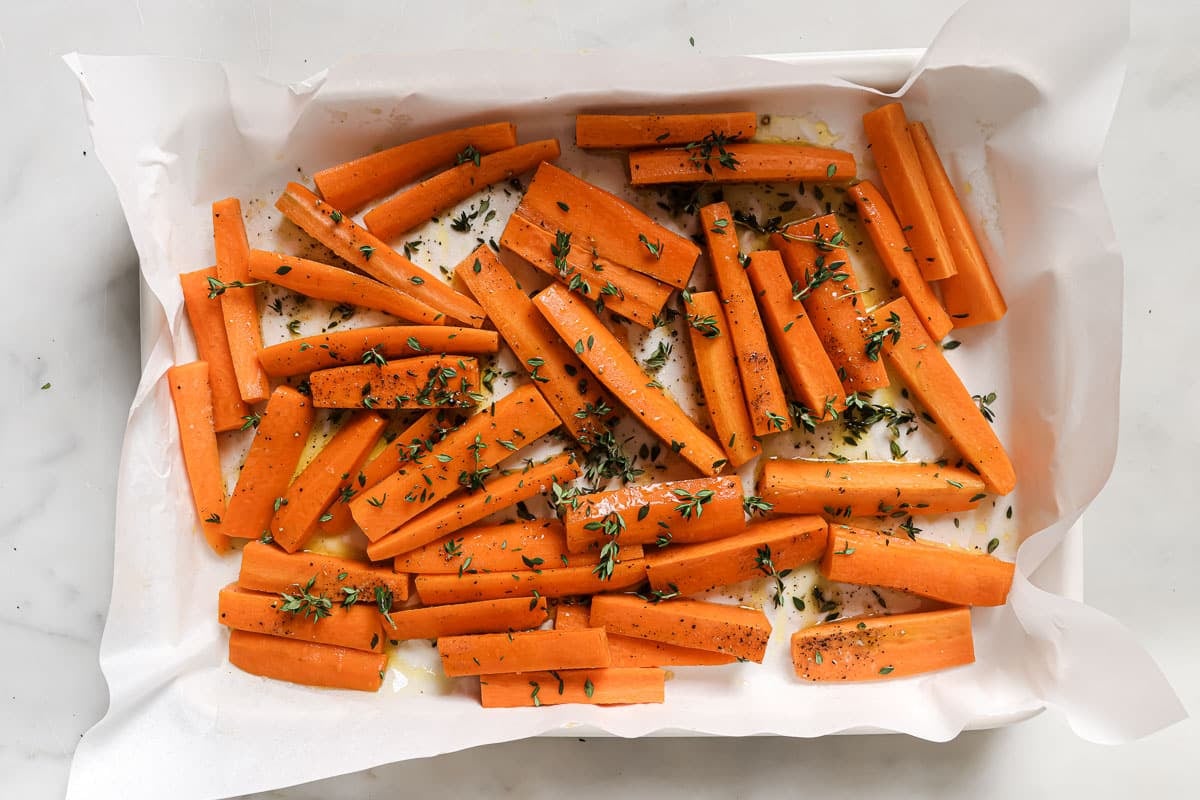 - Carrots: For best results I recommend cutting whole carrots into sticks the same size. Baby carrots don’t roast as well because you can end up with a variety of sizes in a single bag, some quite thick and some very thin. The smaller ones require a shorter cooking time than the bigger ones. The different sizes will result in uneven cooking. When you cut the carrots into sticks yourself you have control over the sizing.