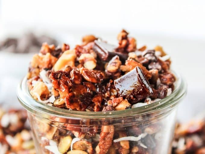 This grain free granola is crunchy and indulgent. It’s sweetened with maple syrup or honey and loaded with nuts, shredded coconut, and chocolate chunks for a delicious treat!