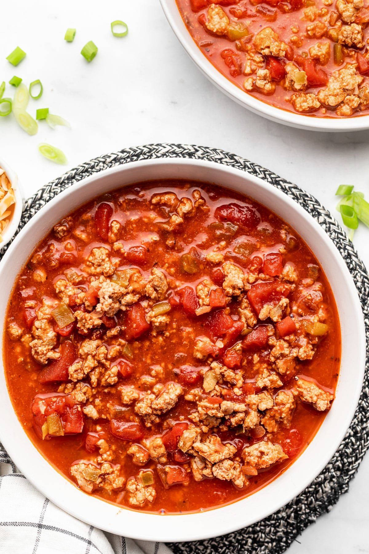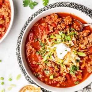 - Lean ground turkey: I use lean ground turkey in this chili. You can also use ground beef if you like or try my No Bean 30 Minute Chili instead. That recipe is tested for ground beef and the seasonings have been adjusted to account for the difference in flavor.