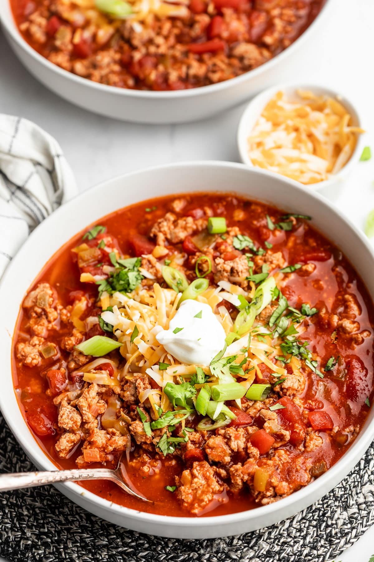 You’ll start by sautรฉing onion, bell pepper, and garlic on medium-high heat. Then brown your ground turkey. Once done, add in all remaining ingredients and let it simmer on medium heat to medium-low heat for 15 to 20 minutes. Ladle into bowls and top with fun toppings like a dollop of sour cream or shredded cheese. You’ll find many more