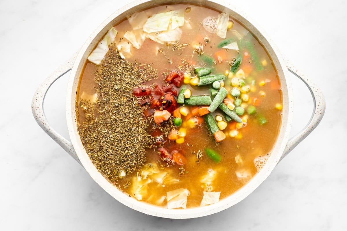 - Reduce heat to simmer, medium or medium low heat. Add the chicken breasts, mixed vegetables, chopped cabbage, canned diced tomatoes, italian seasoning, salt, and pepper to the pot. Simmer for 20 minutes, until chicken is cooked through.