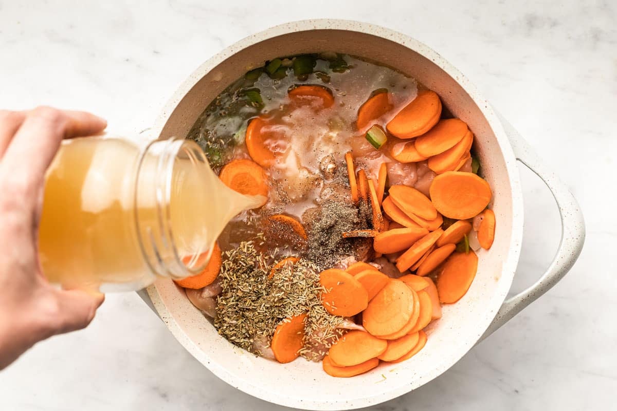 - Add your cooking fat of choice, onion, celery, and garlic to your soup pot. Sautรฉ on medium high heat, stirring frequently, until onion is tender and the garlic has a bit of browning.