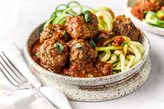 These meatballs and sauce are perfect over pasta. I personally love this with zoodles or Roasted Spaghetti Squash for a low carb meal!