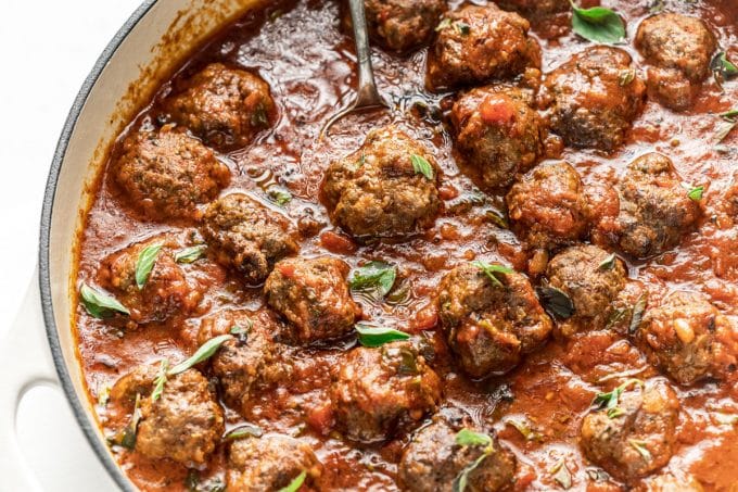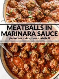 These meatballs with marinara sauce are full of flavor and packed with garlic and fresh herbs! Plus they’re dairy free and gluten free but you wouldn’t guess it from the taste.