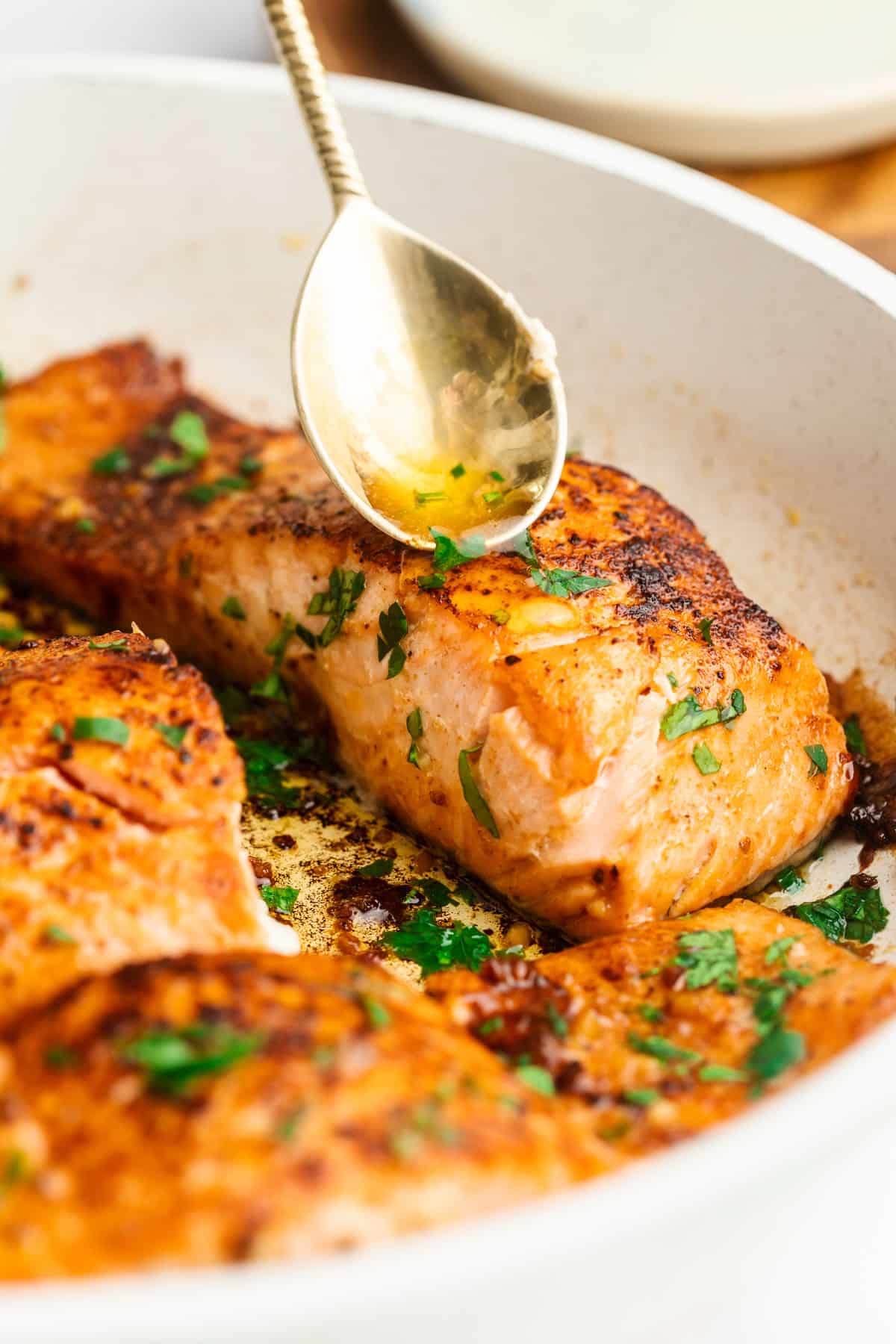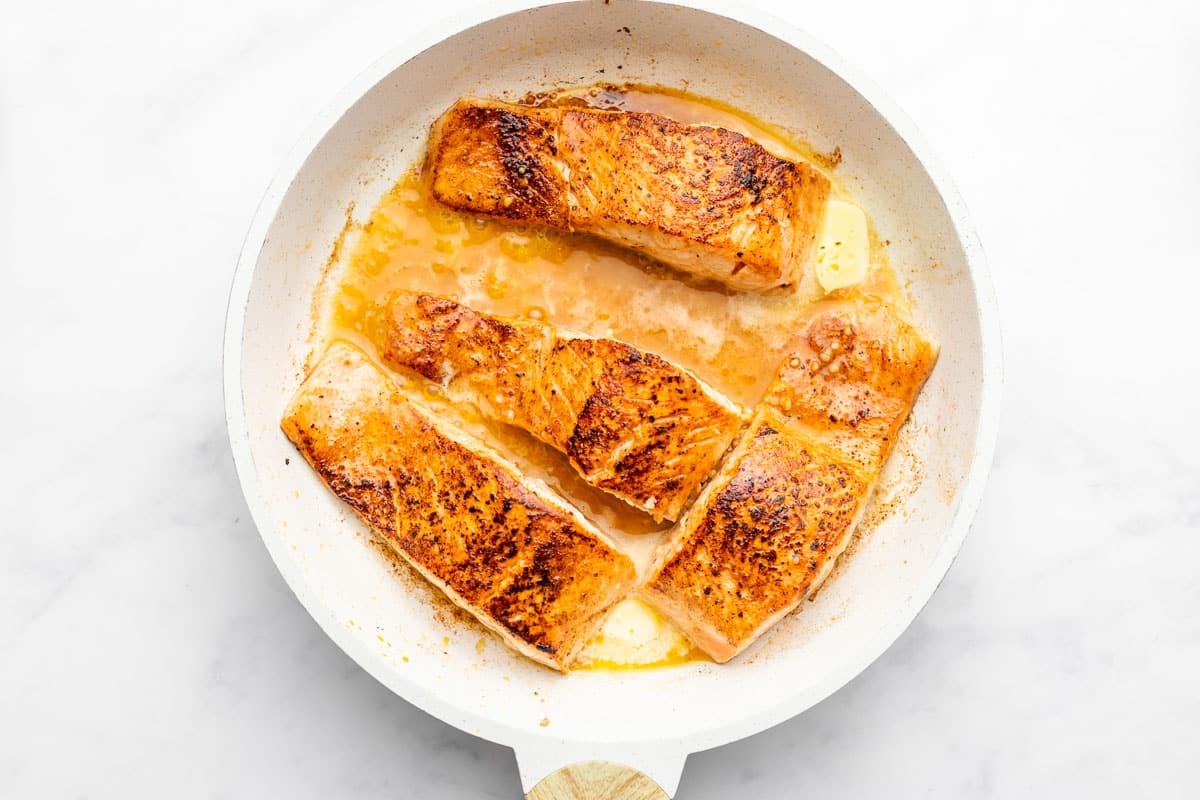 While there are plenty of ways to make delicious salmon (I have great recipes for both the air fryer and oven), pan searing in a hot skillet is my favorite way to cook it. A game changer! When you sear salmon you get a crust on the outside that’s so satisfying with the tender inside of the fish.