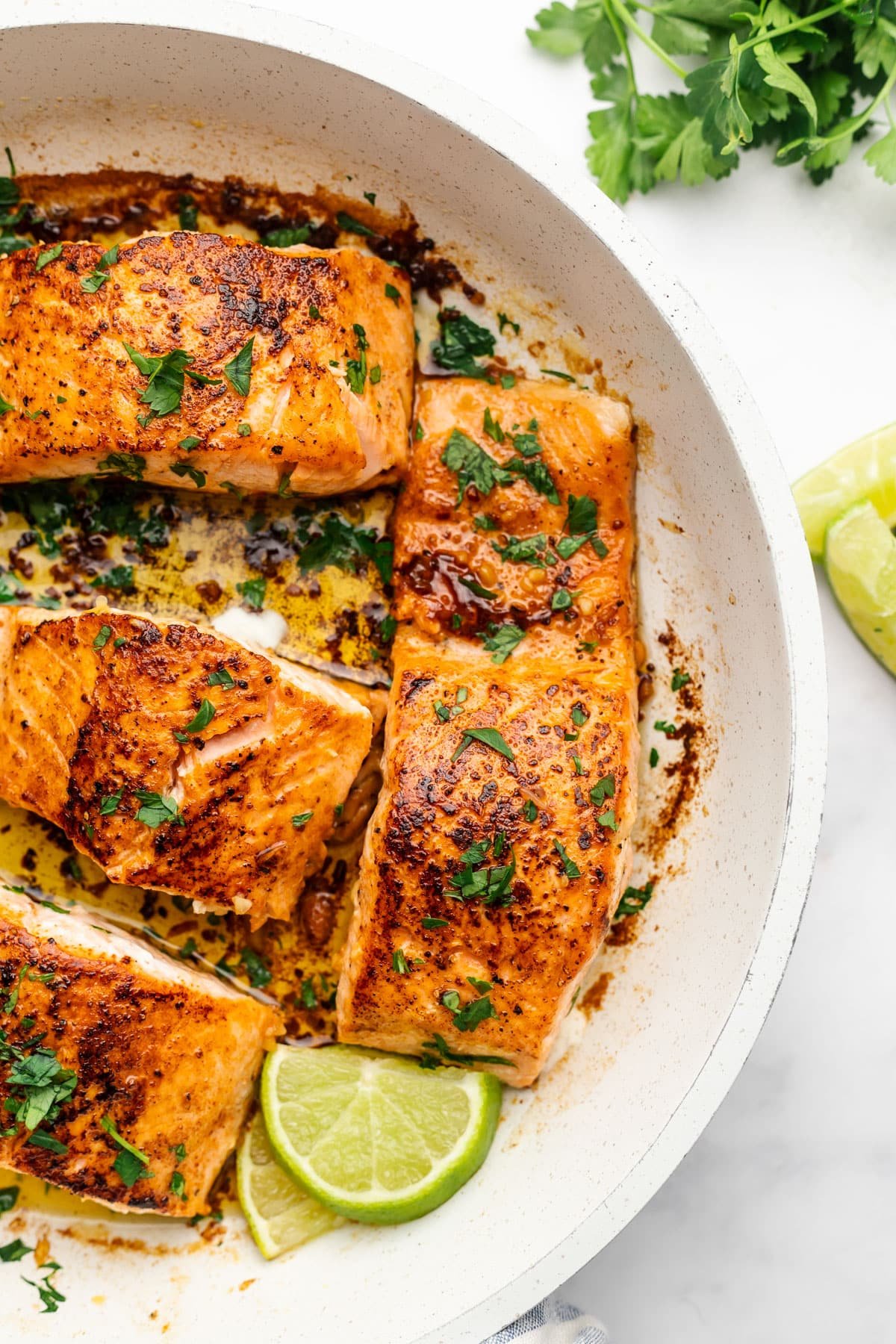 Pan searing is a simple cooking technique that will produce the very best salmon. We’re cooking on medium-high heat to achieve the crispiness we want on the outside. This makes it especially important that you pay close attention to your fish as it cooks because it can quickly get overdone. It takes no more than 7 to 9 minutes total cook time in a skillet and the time varies based on the thickness of the fish and how high your heat is.