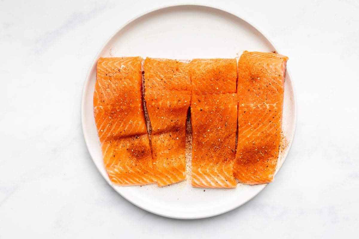 - Season the top of the salmon (if your salmon has skin on one side this will be the side without skin) with salt, pepper, and chipotle chile pepper. Gently press the seasonings into the salmon.