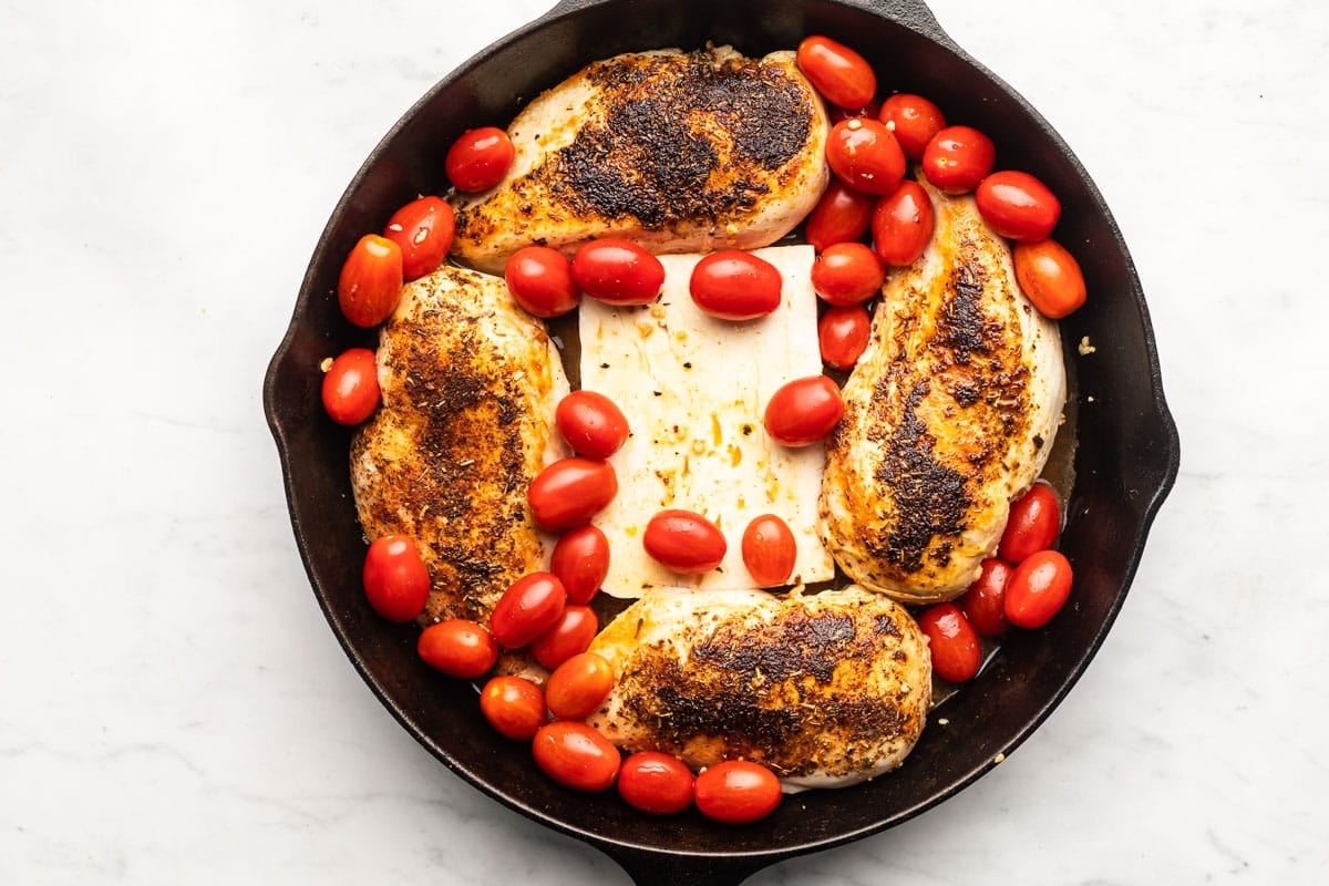 - Add chicken stock and lemon juice to the skillet. Move the chicken to the outside of the skillet and then place the block of feta in the center of the skillet. Add tomatoes to the skillet. Spoon some of the liquid over the feta and tomatoes.