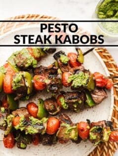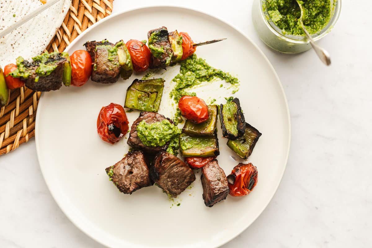 In these kabobs we’re using tomatoes and green bell pepper. The steak marinade we’re using is uncomplicated. Just two ingredients to help us achieve a more tender, flavorful steak! And then there’s the Pistachio Lemon Pesto. This pesto recipe is simple to make and packs a powerful punch. Plus it’s dairy free (no parmesan cheese!) which makes it lower in calories than traditional pesto. You can of course use a prepared pesto from the grocery store to save more time if you prefer.