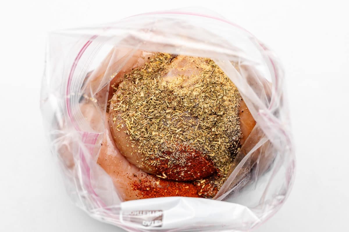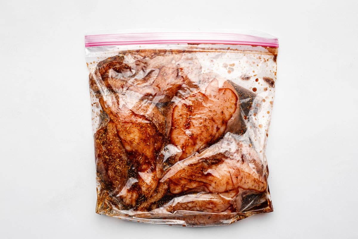 - Add chicken and all marinade ingredients to a gallon ziploc bag. (If using chicken breasts that are quite thick, slice horizontally to create thin cutlets. This helps us cook the chicken faster and gets us better browning on all sides.) Squeeze out excess air and zip closed. Lay flat, spreading the marinade inside the bag so that it's distributed evenly around the chicken. Let marinate for a minimum of 1 hour. I prefer to let it marinate for several hours or overnight if possible.