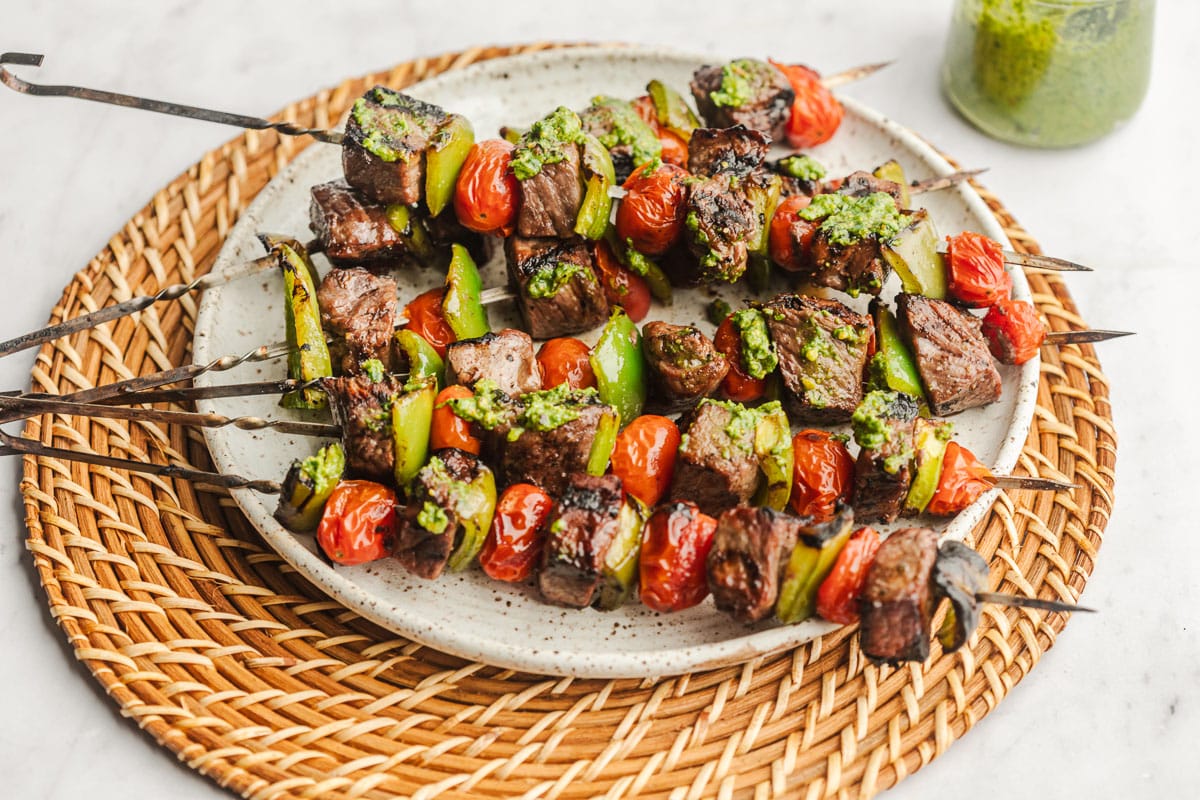 Pesto Steak Kabobs with Blistered Tomatoes & Peppers