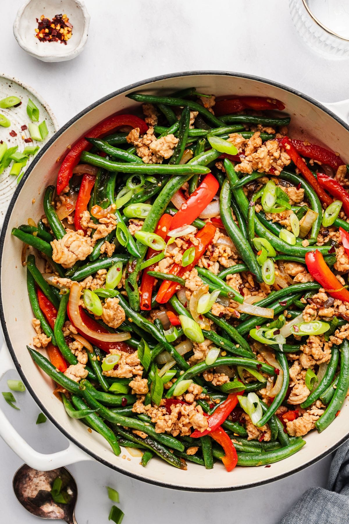 Ground chicken, green beans, bell pepper, and onion all simmer in a delicious sauce in this 30-minute stir fry! This entree is loaded with protein and can be served with rice, cauliflower rice, or even roasted potatoes.