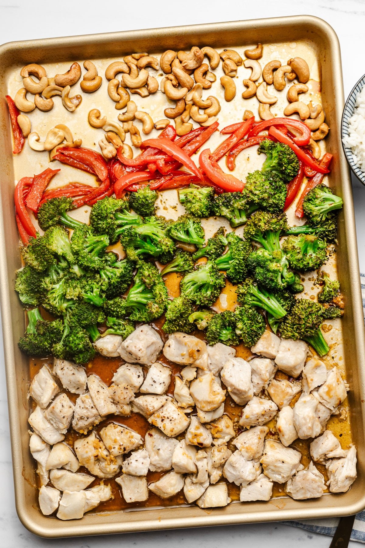 - Remove from the oven and separate the chicken if it’s sticking together. Make room for the cashews and add to pan. Place back in the oven and bake for 5 additional minutes.