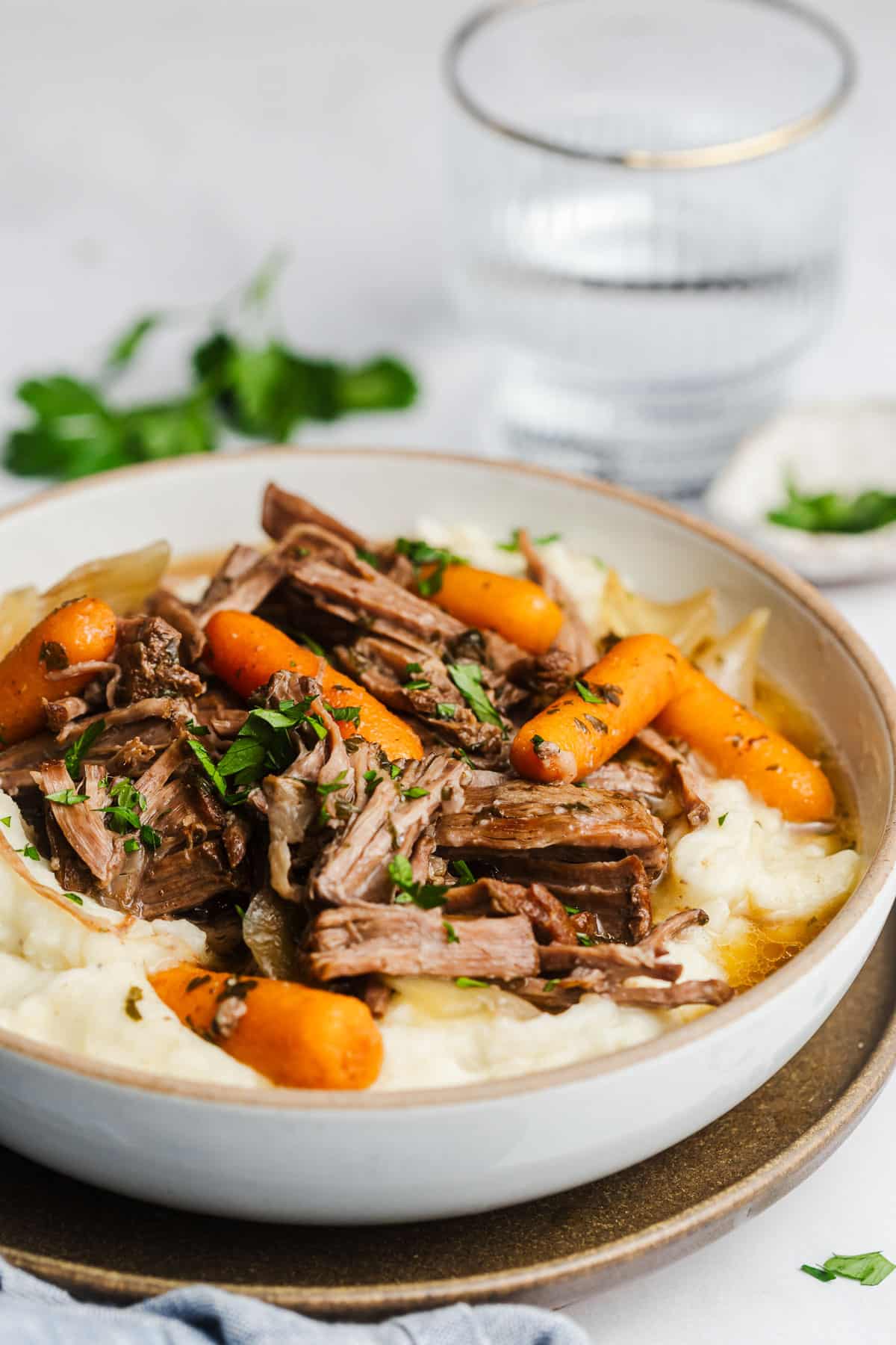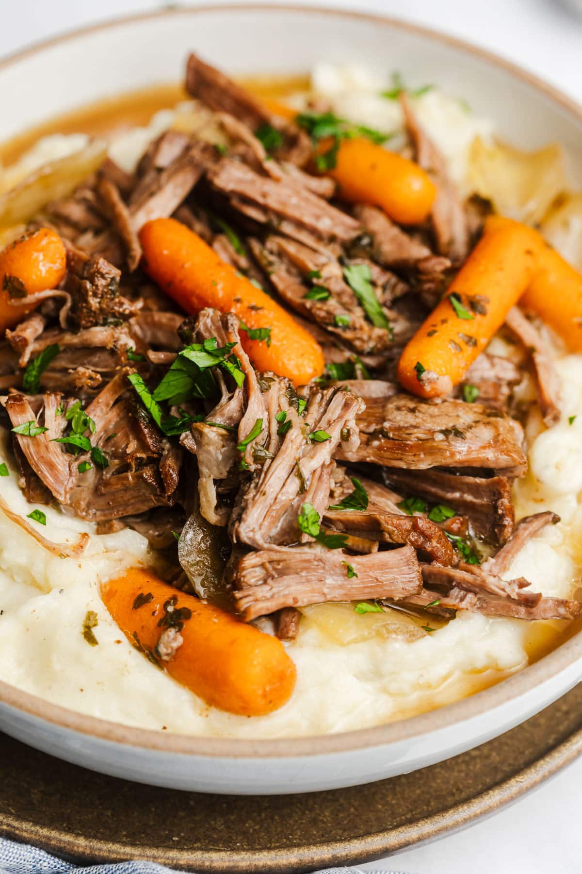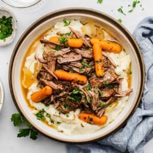 Use two forks to shred finished pot roast and add back to the slow cooker. Taste. Add extra salt or pepper if desired. Serve over Light & Creamy Mashed Potatoes and top with fresh rosemary, parsley, or thyme. Ladle some of that “+{:}P – brown gravy on top